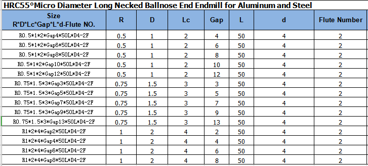 HRC55, 2 Flute, Solid Carbide Endmill, Micro Diameter,Long Necked, Square End, Ballnose, for Steel Processing